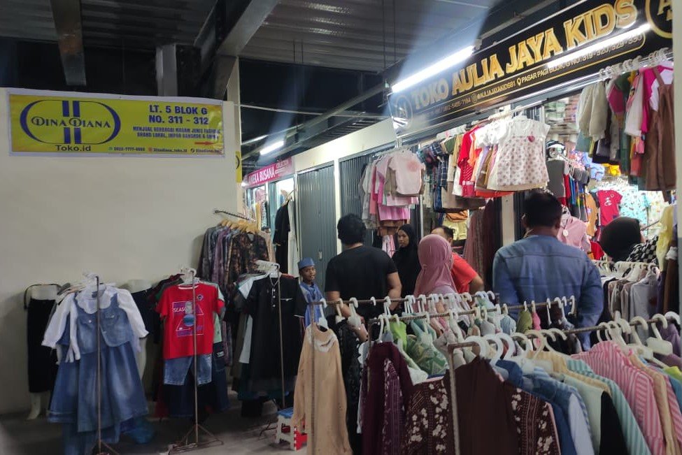 Sejak pagi hingga siang hari, kawasan pusat perdagangan tersebut dipadati warga yang datang untuk berbelanja berbagai kebutuhan Lebaran, terutama pakaian baru.