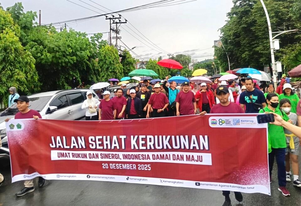 Samarinda, Natmed.id – Meski diguyur gerimis sejak pagi, Jalan Sehat Kerukunan Umat Beragama yang digelar Kementerian Agama (Kemenag) Provinsi Kalimantan Timur (Kaltim) tetap berlangsung meriah dan diikuti antusias oleh ratusan peserta, Sabtu, 20 Desember 2025. Kegiatan ini menjadi bagian dari rangkaian peringatan Hari Amal Bakti (HAB) Kementerian Agama ke-80.