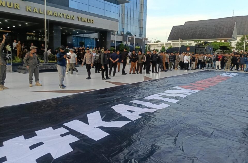 Di akhir kegiatan, terlihat spanduk bertuliskan #KaltimDaruratKKN dibentangkan di halaman kantor gubernur sebagai simbol tuntutan.