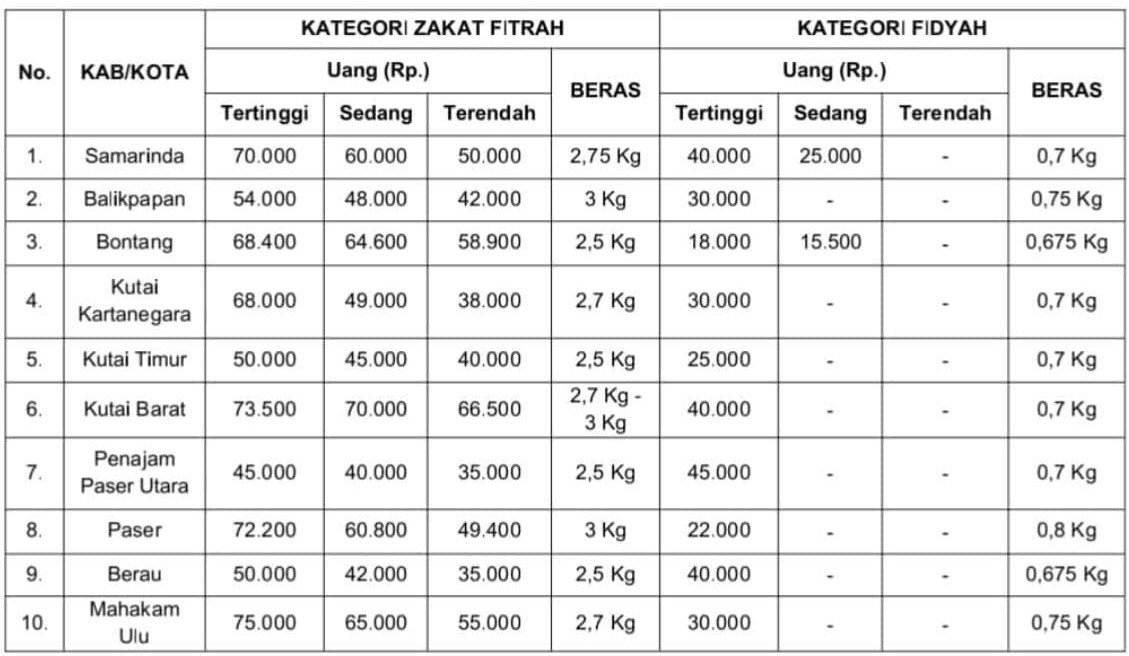 Berdasarkan penetapan yang disepakati bersama tokoh agama, Kementerian Agama, serta mengacu pada data harga dari Dinas Perdagangan, besaran zakat fitrah di Kalimantan Timur adalah sebagai berikut: